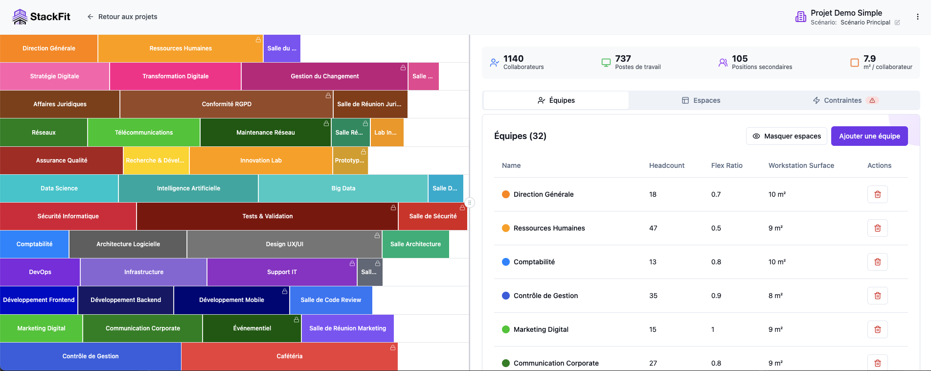We recommend organizing co-construction workshops with stakeholders. During these sessions, you can modify the stacking plan live in Stackfit and instantly visualize the impact on synergies, business constraints, surface area and floor capacity. This gives participants clear visibility on whether constraints are respected. The workshop becomes participative, and visual representations help stakeholders understand why some requests may be impossible given the building’s constraints.
