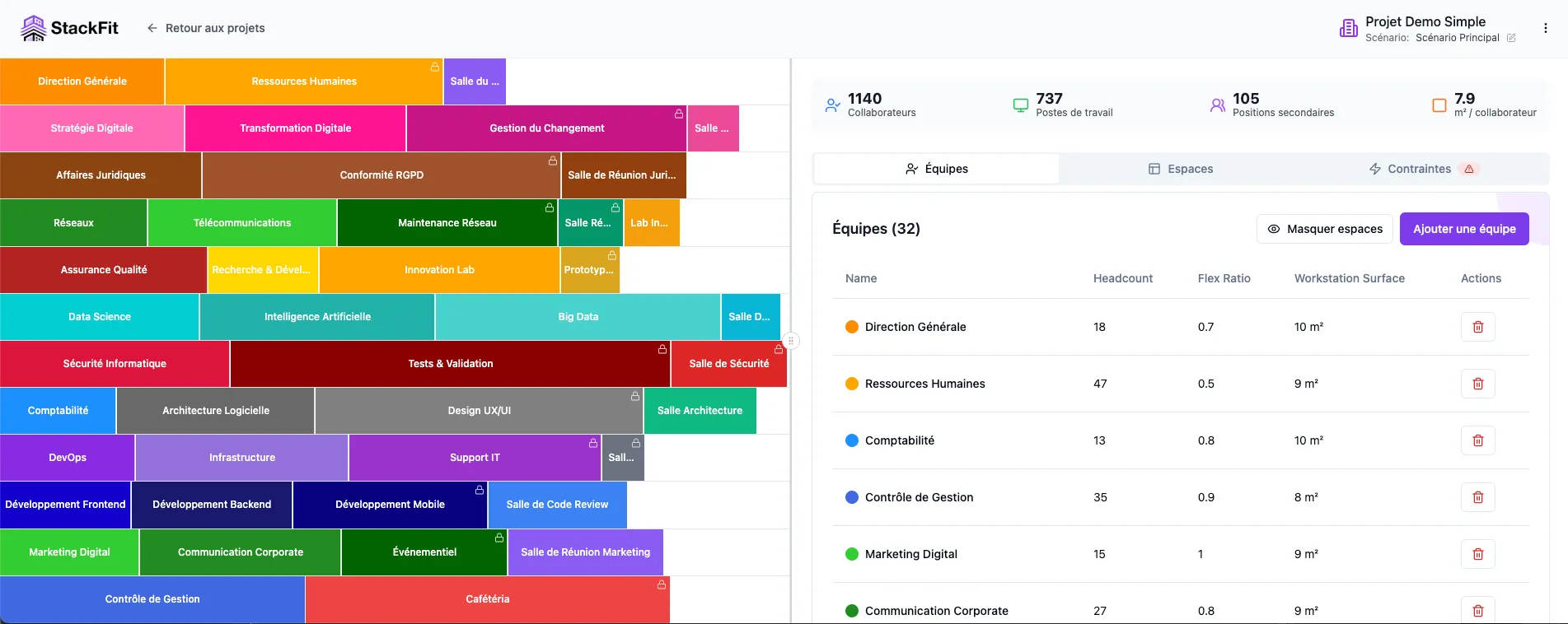 As soon as you open Stackfit, you visualize your building as stacked columns representing floors. Each entity, team, or function is symbolized by a block that you can drag and drop onto desired floors. As you place entities, information updates automatically: occupied surface, headcount, occupancy rate, remaining m²…